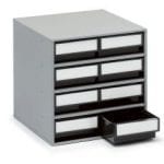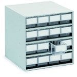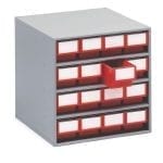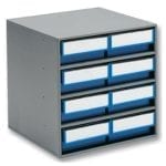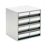 Each container has a corrugated base to simplify picking and sorting through the smallest of parts. The bin is also designed with a full-width label and a fully protective shield. Grey epoxy enamelled steel frames exist in two different sizes, with a depth 300 or 400 mm.