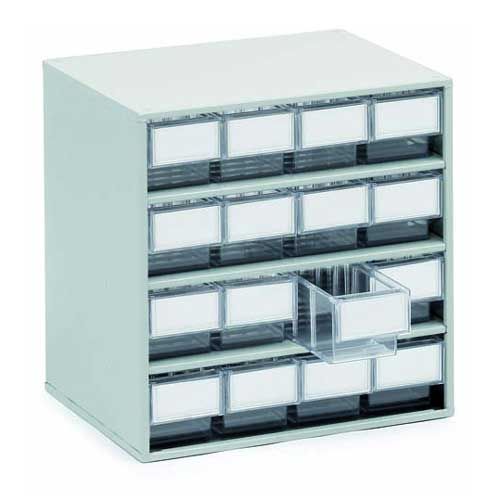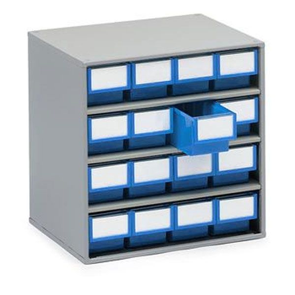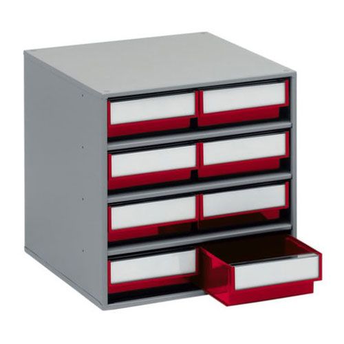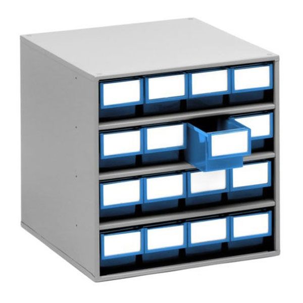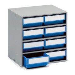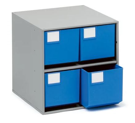 Each container has a corrugated base to simplify picking and sorting through the smallest of parts. The bin is also designed with a full-width label and a fully protective shield. Grey epoxy enamelled steel frames exist in two different sizes, with a depth 300 or 400 mm.
