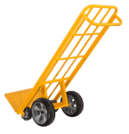 Heavy-duty steel frame construction of traditional delivery trucks with the unique self-supporting wheel base of a Rotatruck. The award-winning self-supporting multi-directional Rotatrucks are based on a highly mobile wheeled base. It eases handling, reduces the risk of injuries, increases productivity and handling speed and provides an immediate return on investment. The All Terrain wheelbase with microcell foam rear wheels navigates with ease through rough surfaces. The heavy-duty yellow powder-coated steel fabrication with an extra big nose carries a load of up to 250kg.