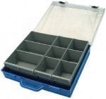 The sturdy carry case is complete with two SPT012 (100 x 300) and one SPT024 (200 x 300) spare parts trays. The base is made from blue ABS plastic and the lid is clear polycarbonate. Easy grip handle and a simple to open and close lid. It is great for tradespeople, builders, etc. It has an internal dimension of 415w x 355d x 100h mm.